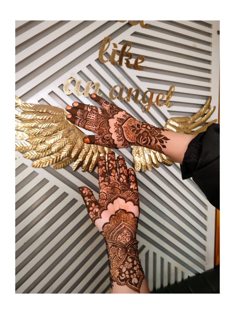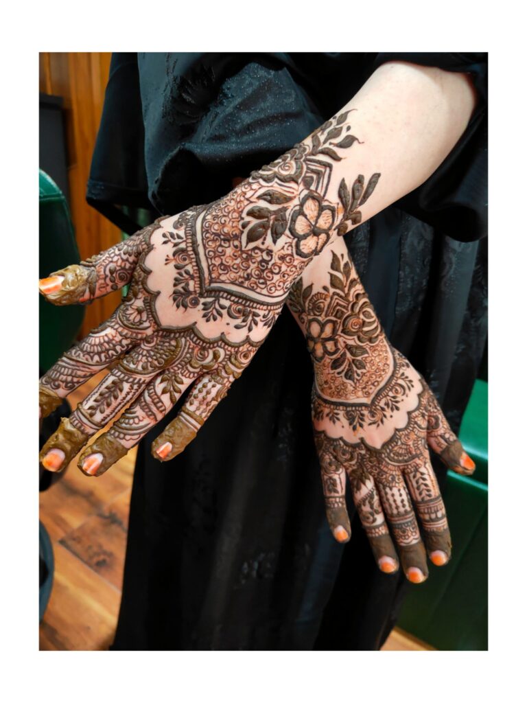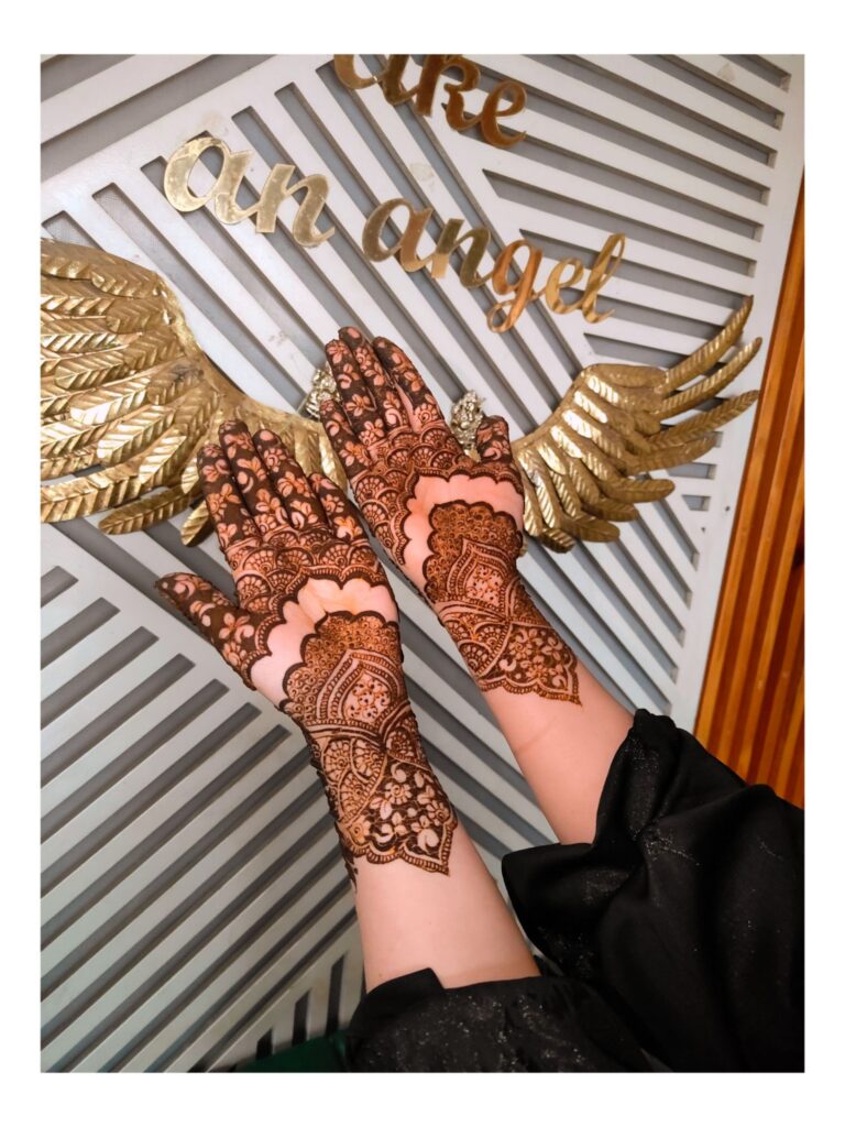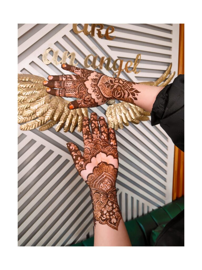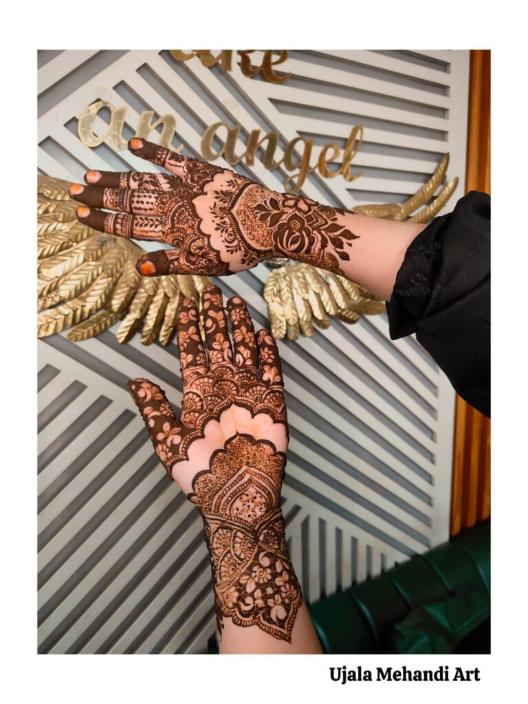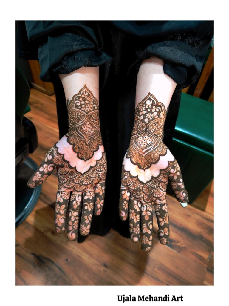 Ujala Mehndi Art Rampur me professional bridal mehndi services provide karta hai. Is design me full hand detailed Arabic pattern, floral motifs aur traditional bridal elements use kiye gaye hain jo haathon ko ek royal aur elegant look dete hain.